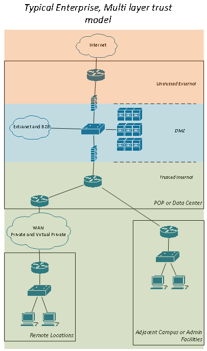An example of a typical enterprise architecture is shown in the figure below. Of note are the segmented trust zones used to protect the resources from untrusted users. Within the internal network devices are usually conformant to an organizations policies and access controls such as 802.1x are positioned at the edge to prevent unauthorized access to the internal resources. Additional third party and vendor based architectures are shown in Appendix A.