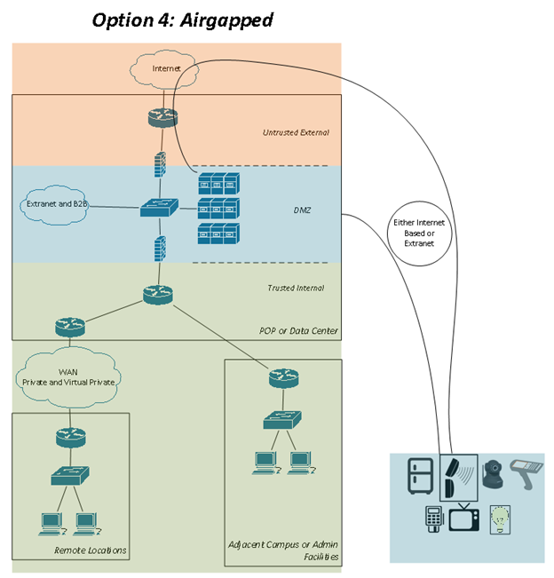 | 4: Airgapped | IOT devices plugged into separate, parallel network which converges via the extranet/DMZ environment. | Enterprise with a high level of exposure to corporate data or intellectual property loss, where the cost to leverage a parallel solution will, at scale, be less expensive from a risk perspective, than to leverage the existing infrastructure. An example may be a financial institution. |