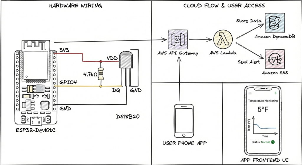 While I had done most of this before, the lamda code and frontend was vibe coded using antigravity. The only functional difference in the drawing below is I don’t measure freezer temperature over time, although I could, I have no reason to today. That is a future development plan, of extremely low priority. The nice thing about this is there would not need to be any changes to ESP32, it would all be backend.